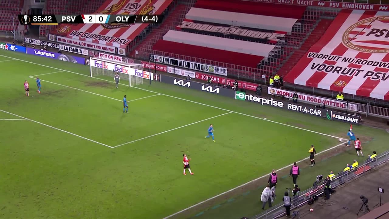 Donyell Malen (PSV Eindhoven) remata al poste derecho| Disparo con la derecha desde fuera del área. Asistencia de Mario Götze.