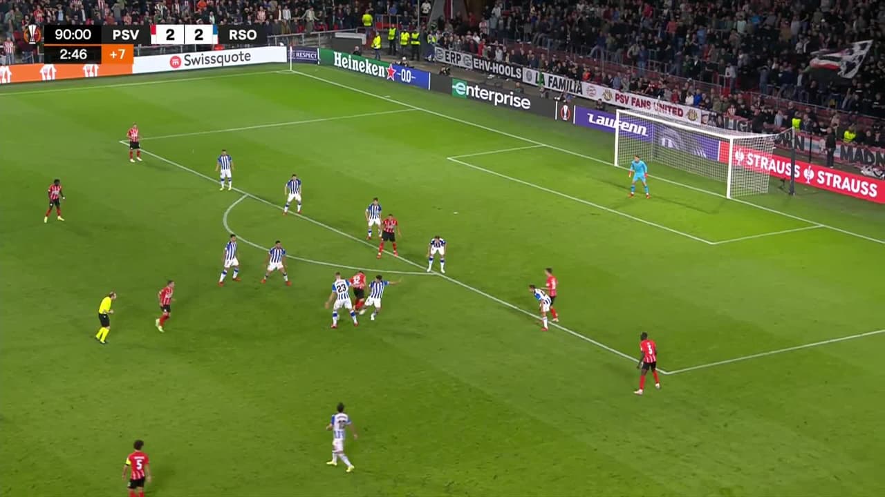 Jordan Teze (PSV Eindhoven Eindhoven) remata poste| remate con la derecha desde fuera del área tras un saque de esquina.