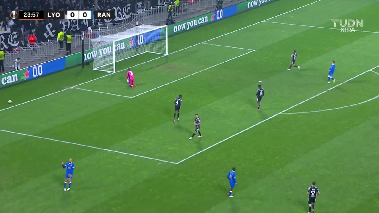 Kemar Roofe (Rangers) remata palo| zurdazo desde fuera del área.