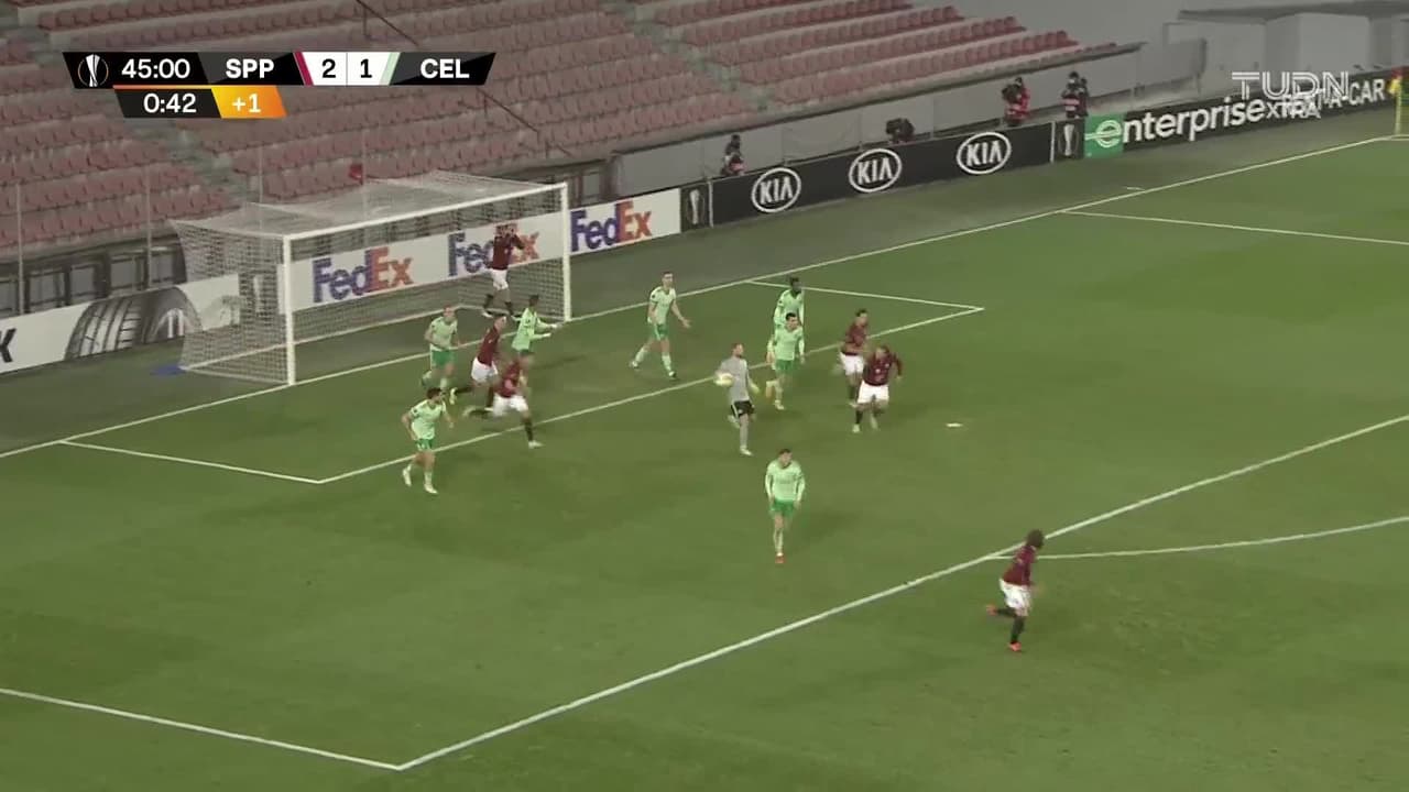 Ladislav Krejci II (Sparta Prague) remata al poste izquierdo| disparo de cabeza desde el centro del área tras el cobro de una falta.