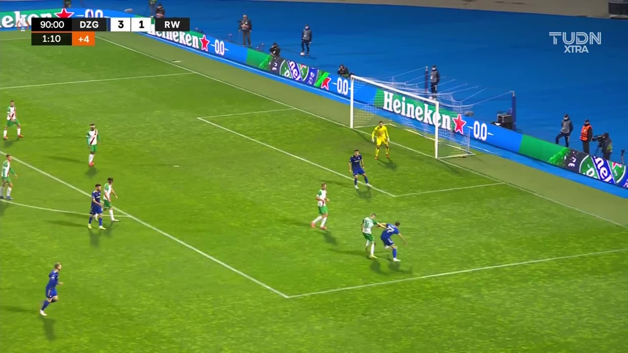 Luka Menalo (Dinamo Zagreb) remata al poste izquierdo| disparo de cabeza desde muy cerca. Asistencia de Amer Gojak.
