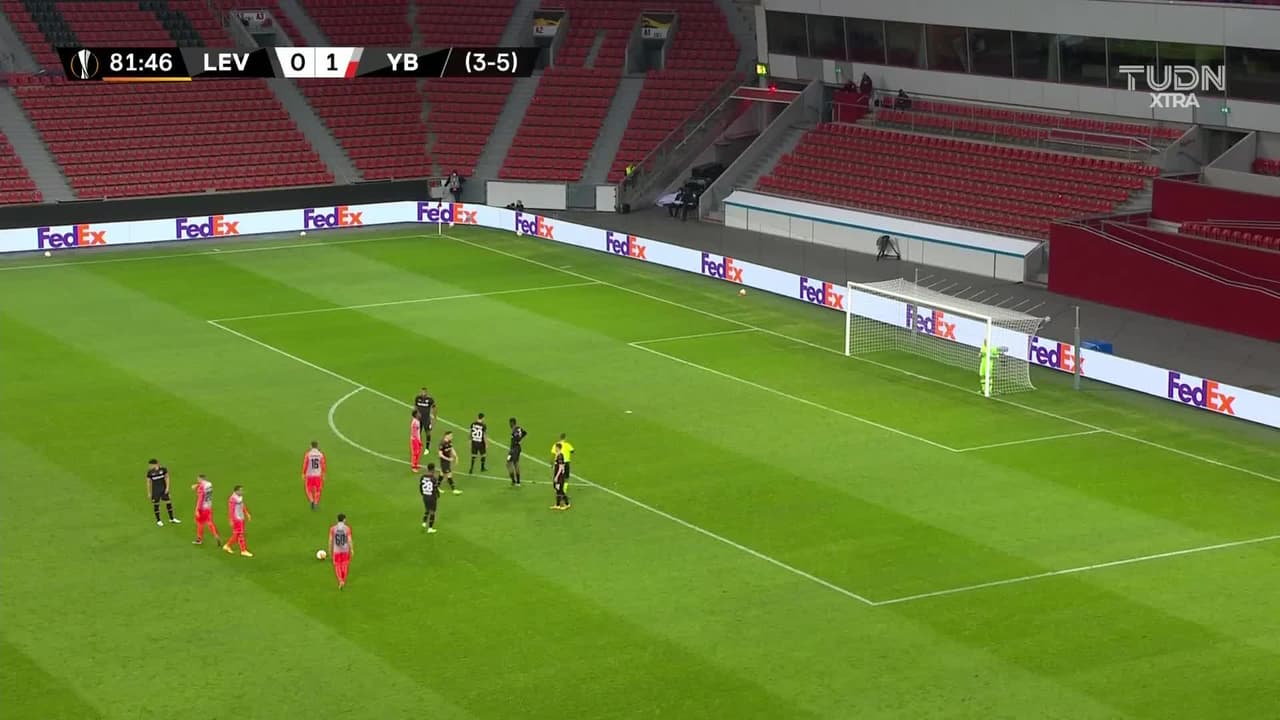 Marvin Spielmann (BSC Young Boys) remata al poste derecho| Disparo con la derecha desde fuera del área de tiro libre directo.