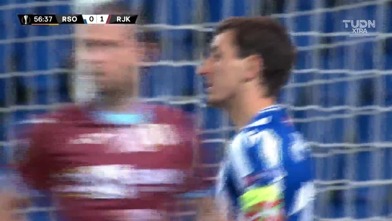Mikel Oyarzabal (Real Sociedad) remata al travesaño| disparo de cabeza desde el centro del área. Asistencia de Adnan Januzaj con un centro al área tras un saque de esquina.
