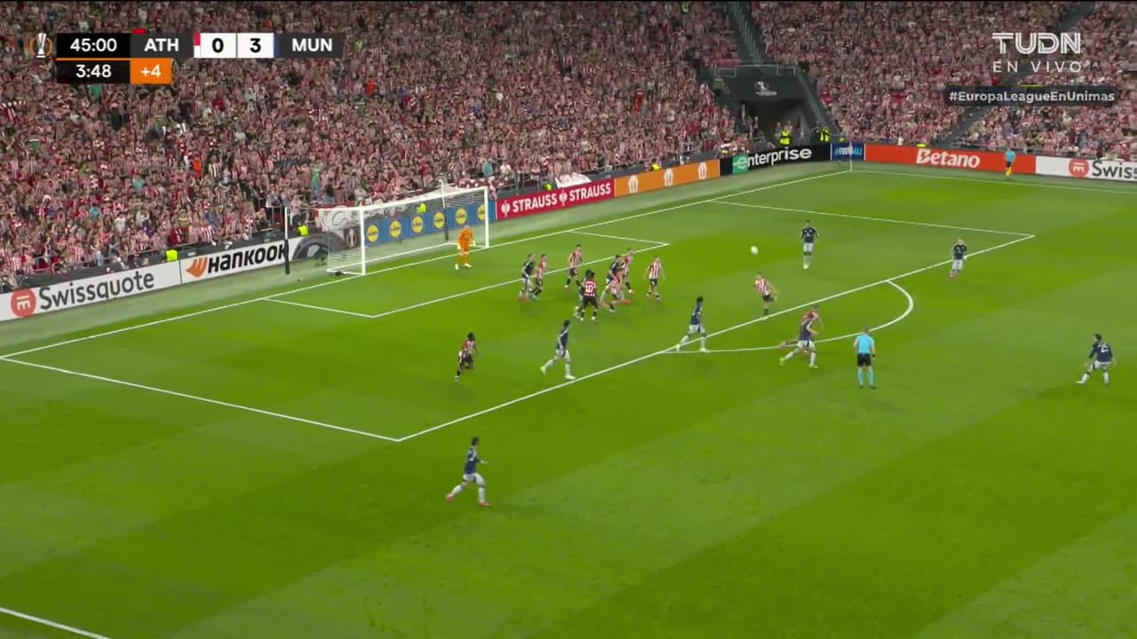 Noussair Mazraoui (Manchester United) remata palo| zurdazo desde el centro del área tras un saque de esquina.
