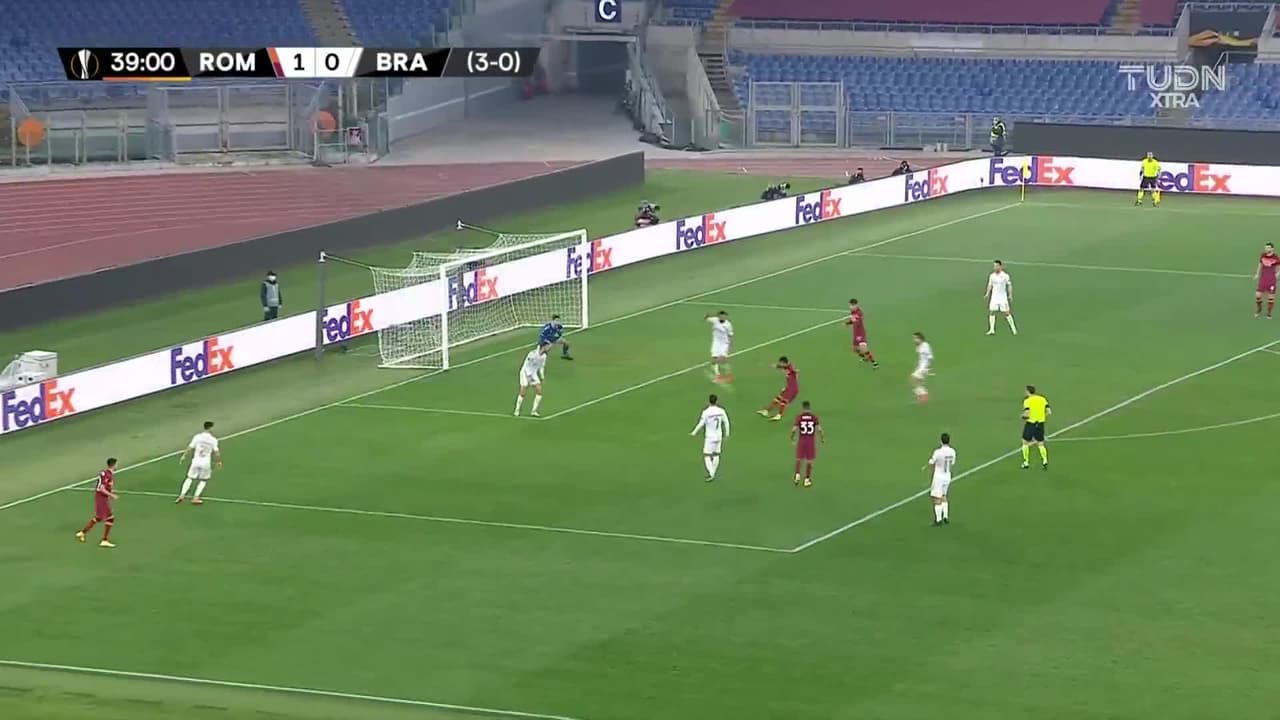 Pedro (AS Roma) remata al travesaño| zurdazo desde el centro del área. Asistencia de Stephan El Shaarawy con un centro al área.