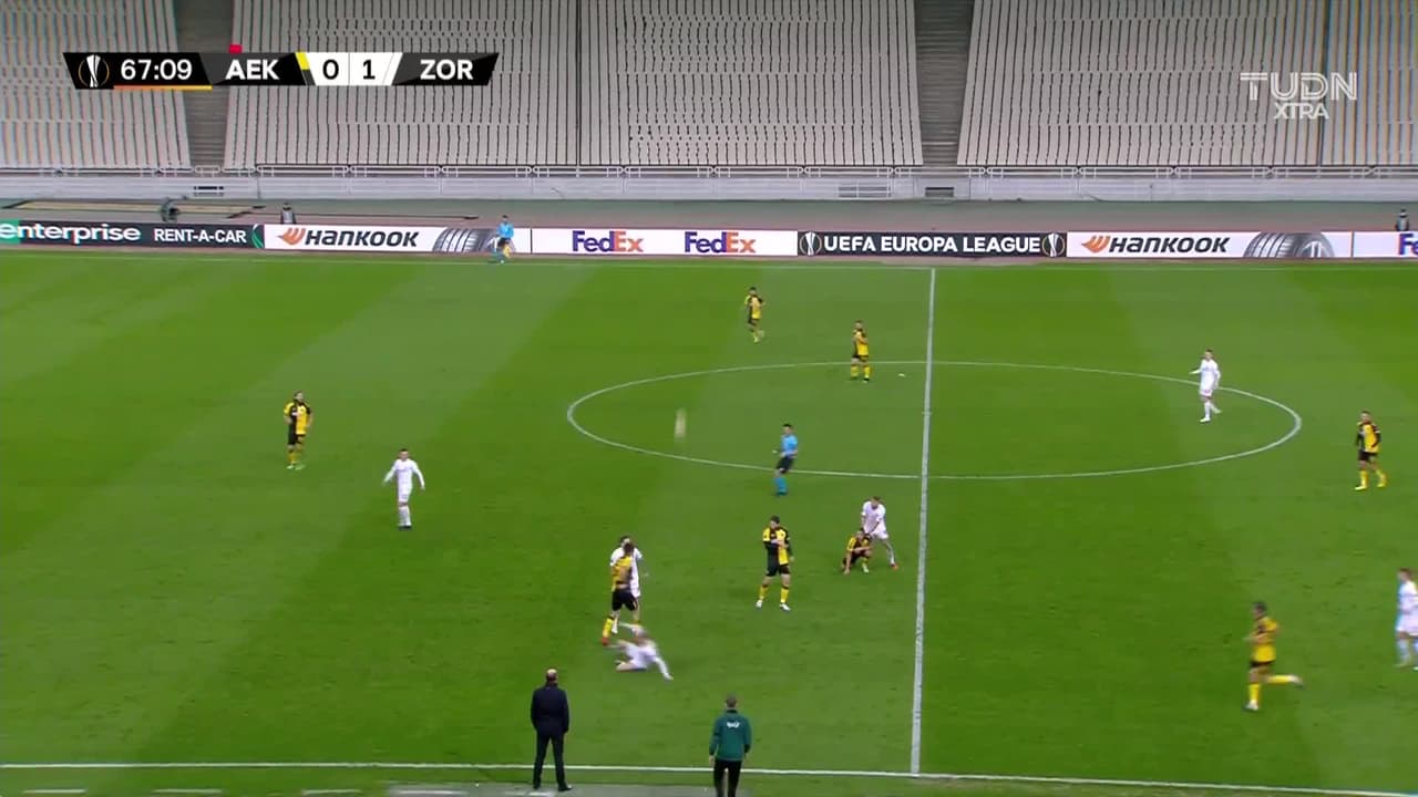 Efstratios Svarnas (AEK Athens) remata palo| disparo de cabeza desde la banda derecha.