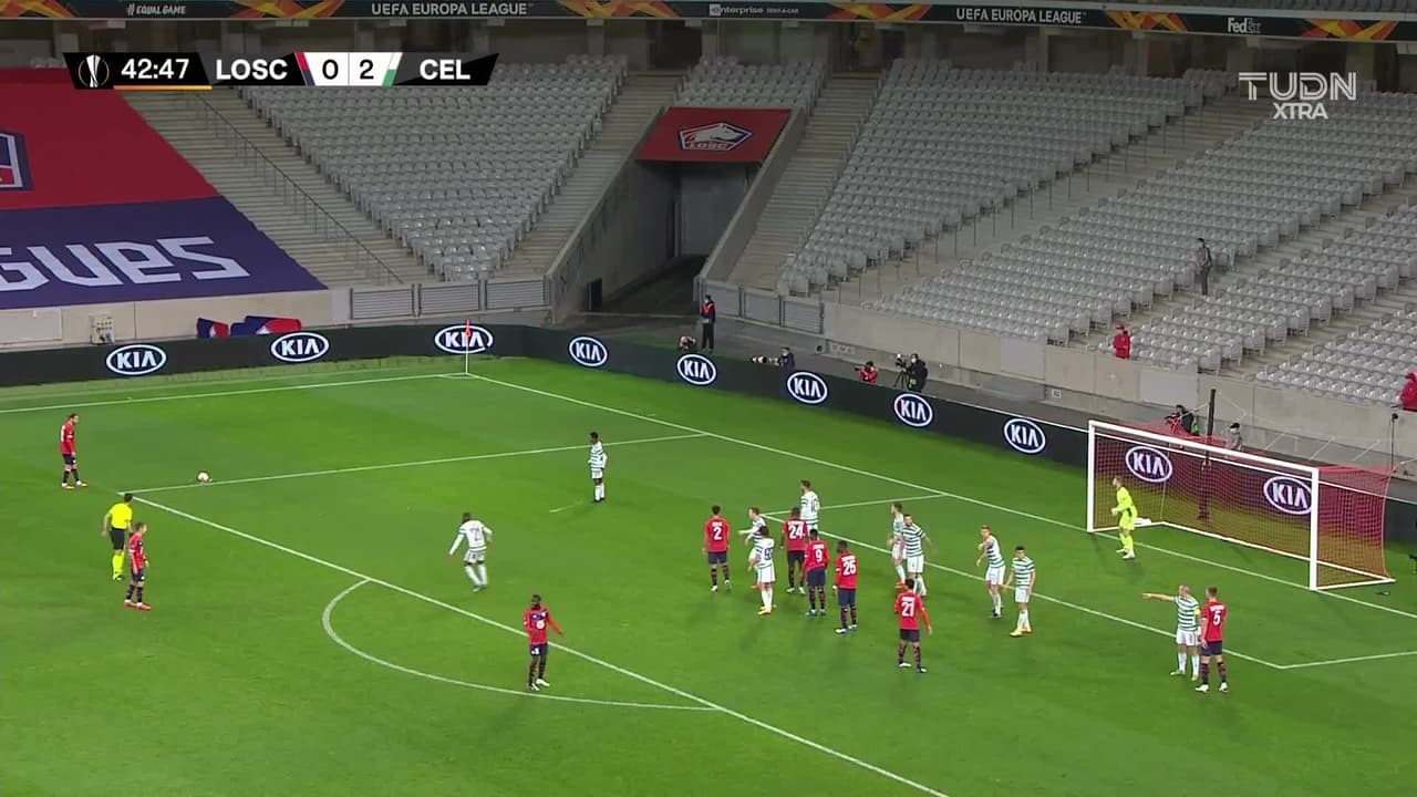 Sven Botman (Lille) remata al travesaño| zurdazo desde fuera del área tras el cobro de una falta.