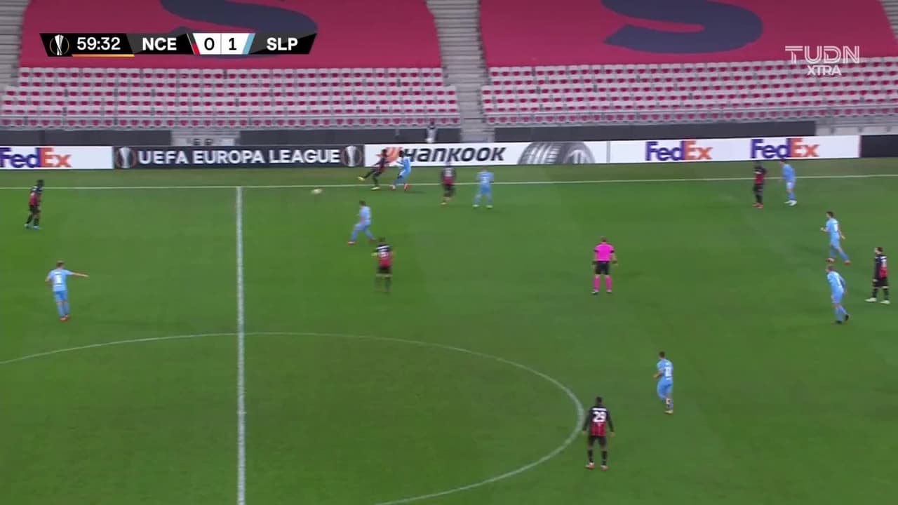 Youcef Atal (Nice) remata al poste izquierdo| Disparo con la derecha desde el lado derecho dentro del área. Asistencia de Rony Lopes después de un pase en profundidad.