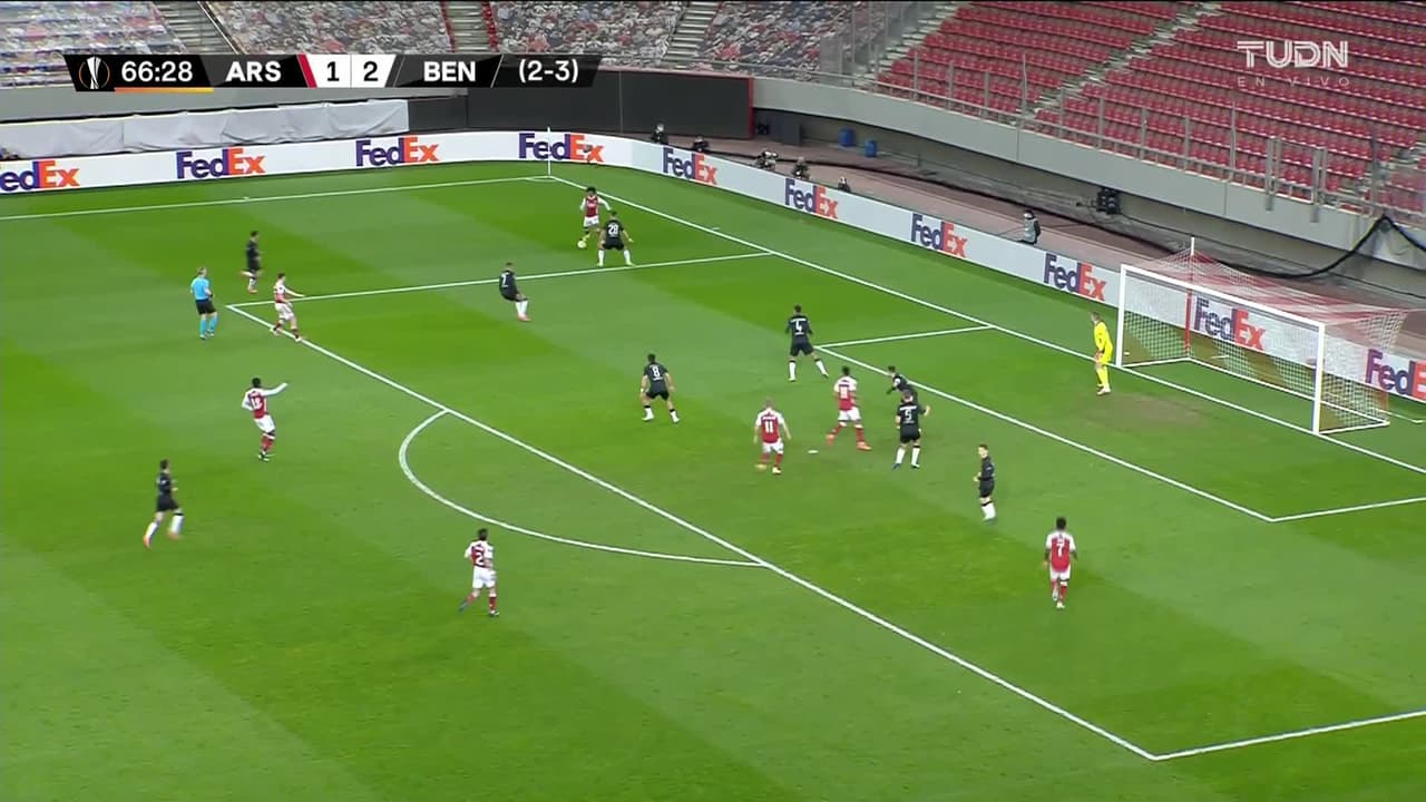 ¡Gol! Arsenal 2| Benfica 2. Kieran Tierney (Arsenal) zurdazo desde el lado izquierdo dentro del área por el lado derecho de la portería. Asistencia de Willian.