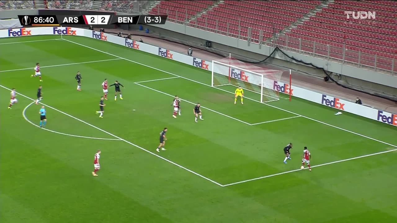 ¡Gol! Arsenal 3| Benfica 2. Pierre-Emerick Aubameyang (Arsenal) disparo de cabeza desde muy cerca por el centro del arco. Asistencia de Bukayo Saka con un centro al área.