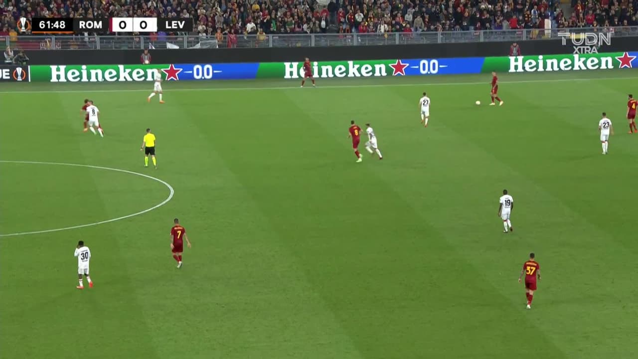 ¡Gol! AS Roma 1| Bayer 04 Leverkusen 0. Edoardo Bove (AS Roma) zurdazo desde el centro del área disparo rastrero| junto al palo izquierdo.