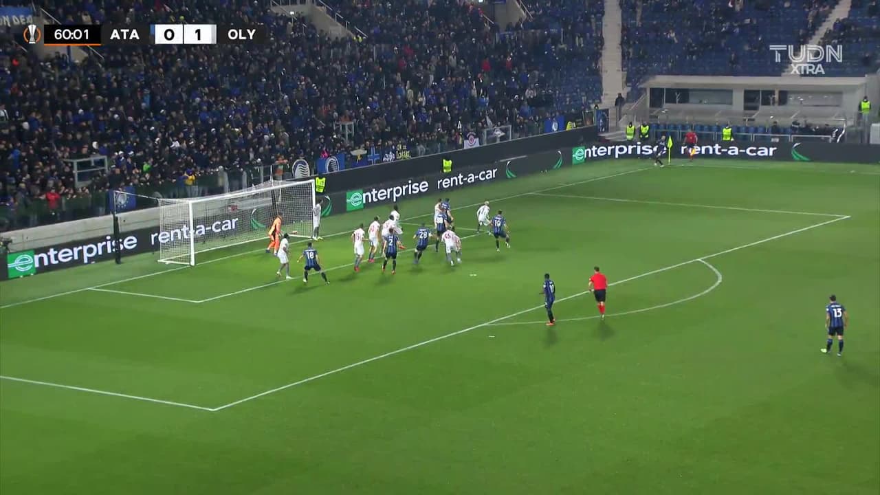 Remate de cabeza del defensa albanés para devolverle el color al Atalanta frente al Olympiacos.