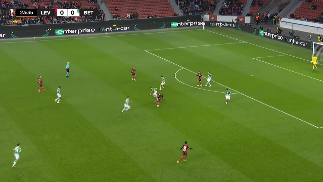 ¡Gol! Bayer 04 Leverkusen 1| Real Betis 0. Jeremie Frimpong (Bayer 04 Leverkusen) Disparo con la derecha desde el centro del área por el lado derecho de la portería. Asistencia de Moussa Diaby.