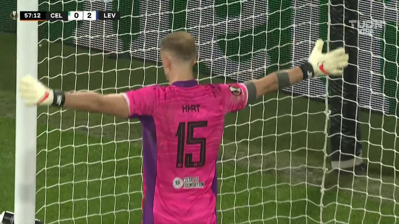 ¡Gol! Celtic 0| Bayer 04 Leverkusen 3. Lucas Alario (Bayer 04 Leverkusen) convirtió el penalti Disparo con la derecha disparo rastrero| junto al palo izquierdo.