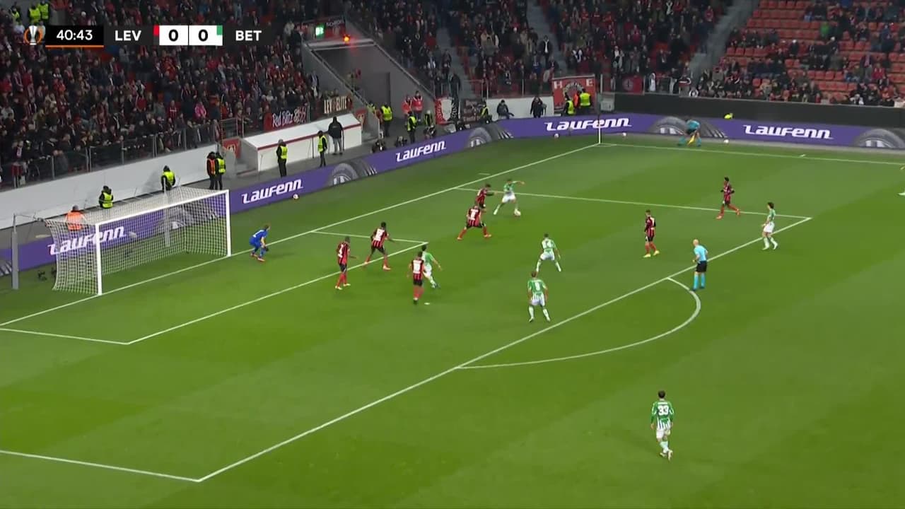 ¡Gol! Bayer 04 Leverkusen 1| Real Betis 0. Moussa Diaby (Bayer 04 Leverkusen) Disparo con la derecha desde el lado derecho dentro del área.