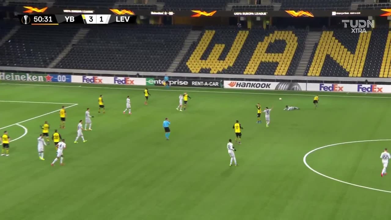 ¡Gol! BSC Young Boys 3| Bayer 04 Leverkusen 2. Patrik Schick (Bayer 04 Leverkusen) disparo de cabeza desde muy cerca por el lado derecho de la portería tras el cobro de una falta.