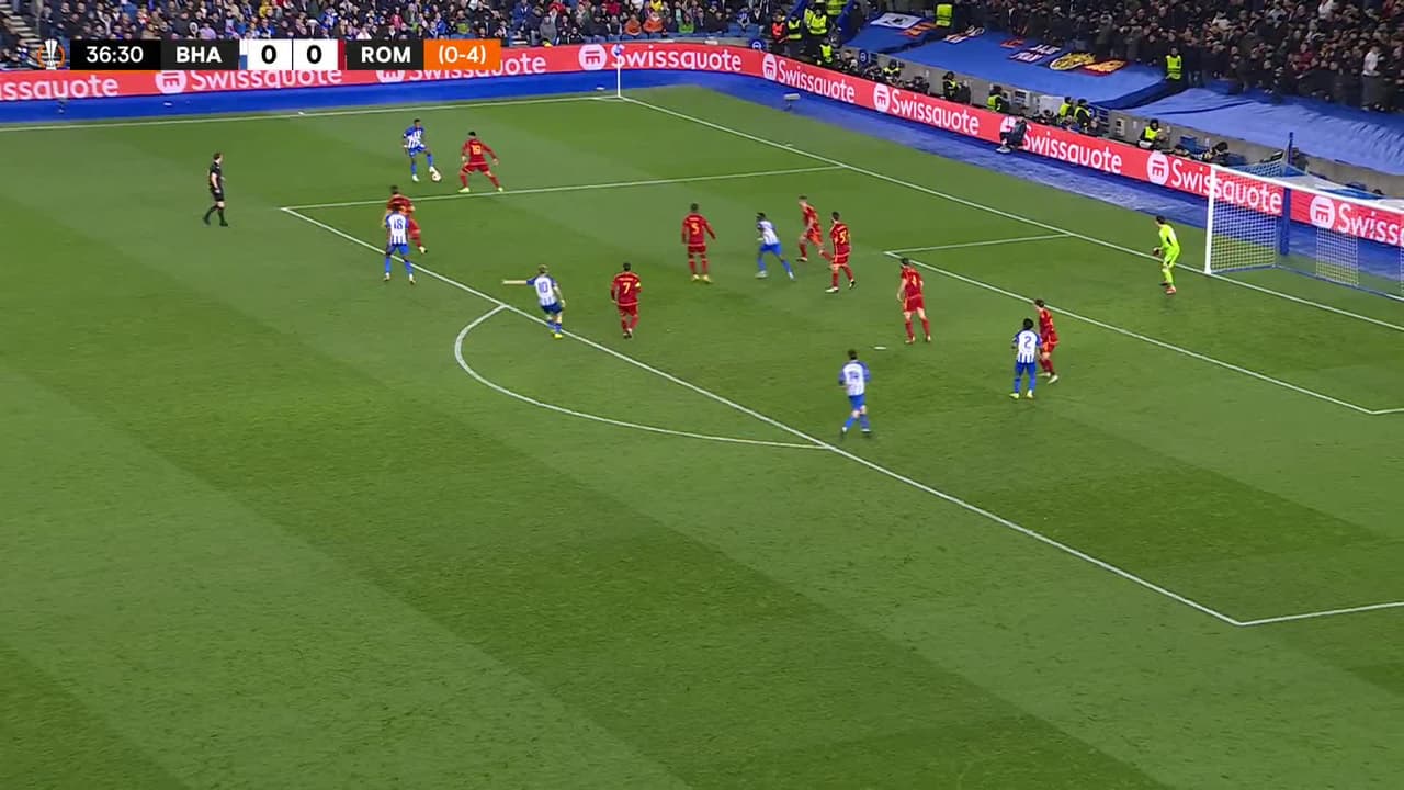 ¡Gol! Brighton and Hove Albion 1| AS Roma 0. Danny Welbeck (Brighton and Hove Albion) Disparo con la derecha desde fuera del área.