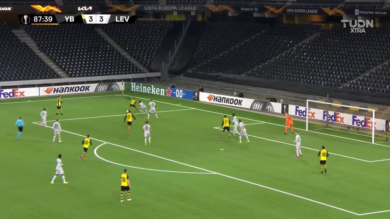 ¡Gol! BSC Young Boys 4| Bayer 04 Leverkusen 3. Jordan Siebatcheu (BSC Young Boys) Disparo con la derecha desde muy cerca por el centro del arco.