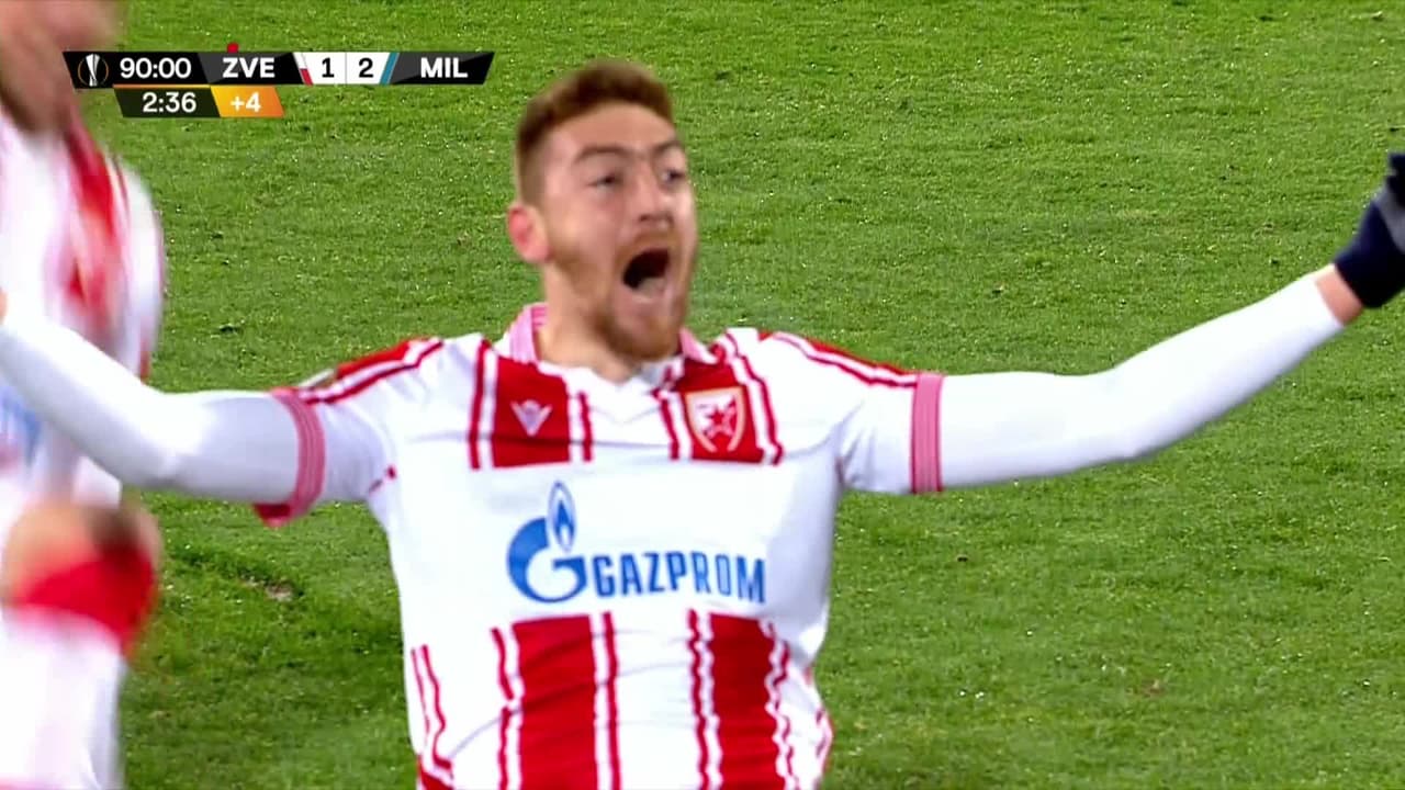 ¡Gol! Estrella Roja de Belgrado 2| Milan 2. Milan Pavkov (Estrella Roja de Belgrado) disparo de cabeza desde el centro del área al ángulo superior izquierdo. Asistencia de Guélor Kanga Kaku con un centro al área tras un saque de esquina.