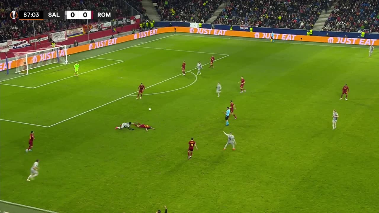 ¡Gol! FC Red Bull Salzburg 1| AS Roma 0. Nicolás Capaldo (FC Red Bull Salzburg) disparo de cabeza desde el centro del área disparo rastrero| junto al palo izquierdo. Asistencia de Strahinja Pavlovic con un centro al área.