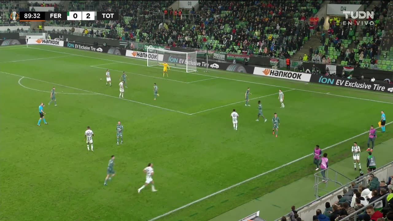 ¡Gol! Ferencvárosi TC 1| Tottenham Hotspur 2. Barnabás Varga (Ferencvárosi TC) Disparo con la derecha desde el centro del área.