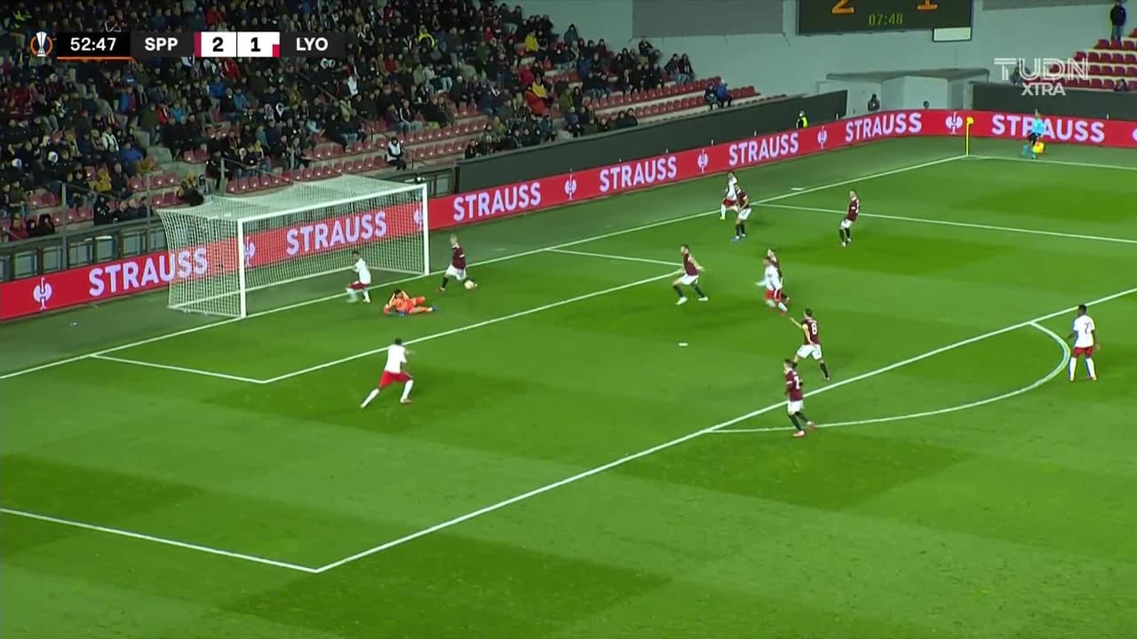 ¡Gol! Sparta Prague 2| Lyon 2. Houssem Aouar (Lyon) zurdazo desde el centro del área al ángulo superior izquierdo.