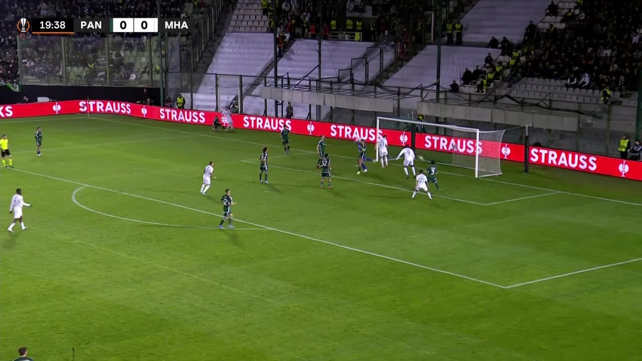 ¡Gol! Panathinaikos 0| Maccabi Haifa 1. Din David (Maccabi Haifa) disparo de cabeza desde muy cerca.