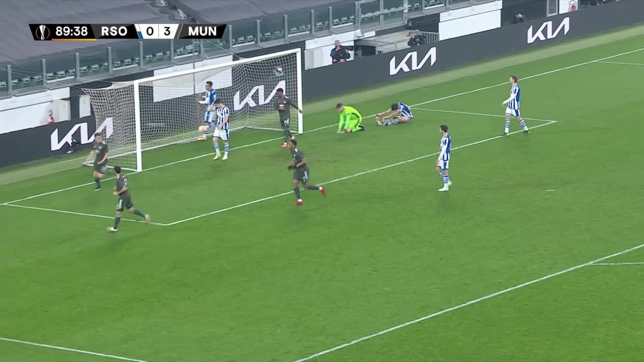 ¡Gol! Real Sociedad 0| Manchester United 4. Daniel James (Manchester United) Disparo con la derecha sin ángulo desde la derecha disparo rastrero| junto al palo izquierdo. Asistencia de Eric Bailly pase largo tras un contragolpe.
