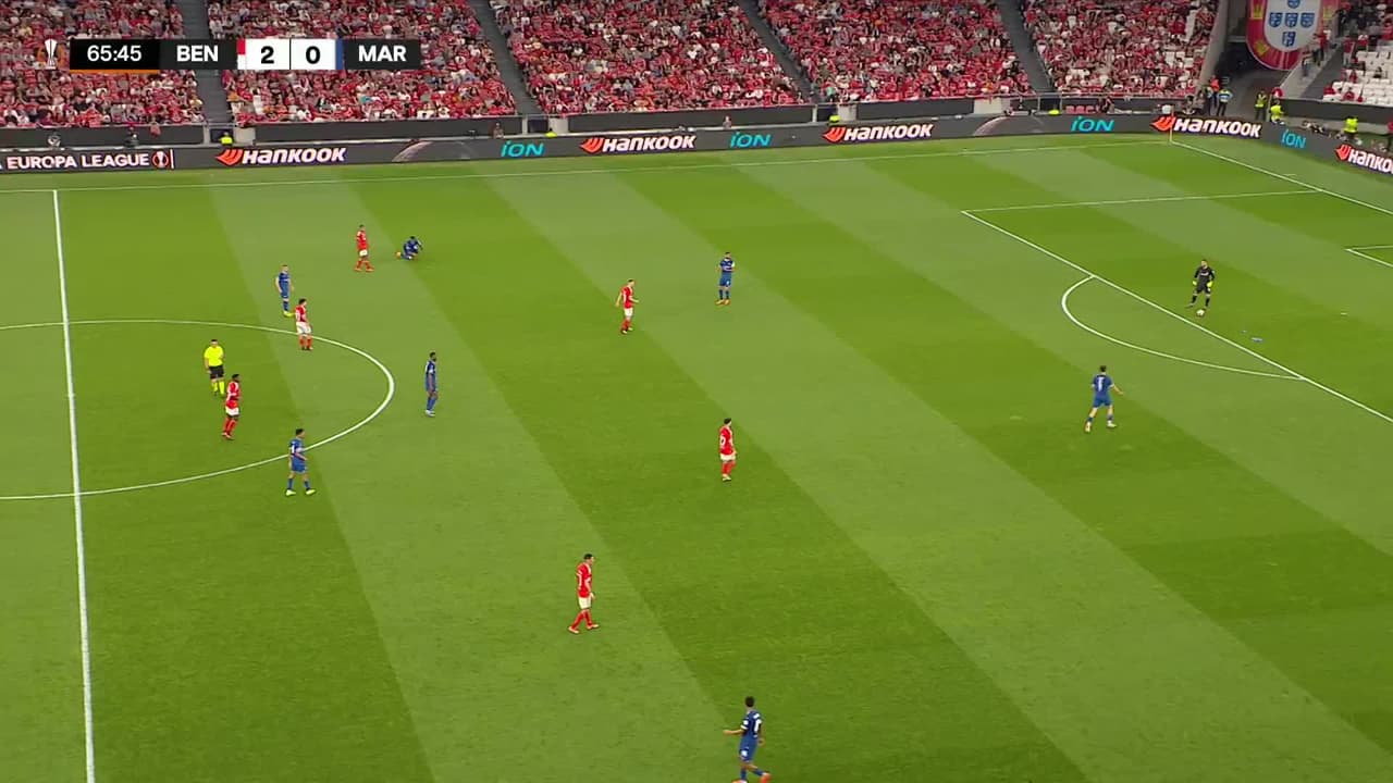 ¡Gol! Benfica 2| Marseille 1. Pierre-Emerick Aubameyang (Marseille) Disparo con la derecha desde el lado izquierdo dentro del área tras un contragolpe.