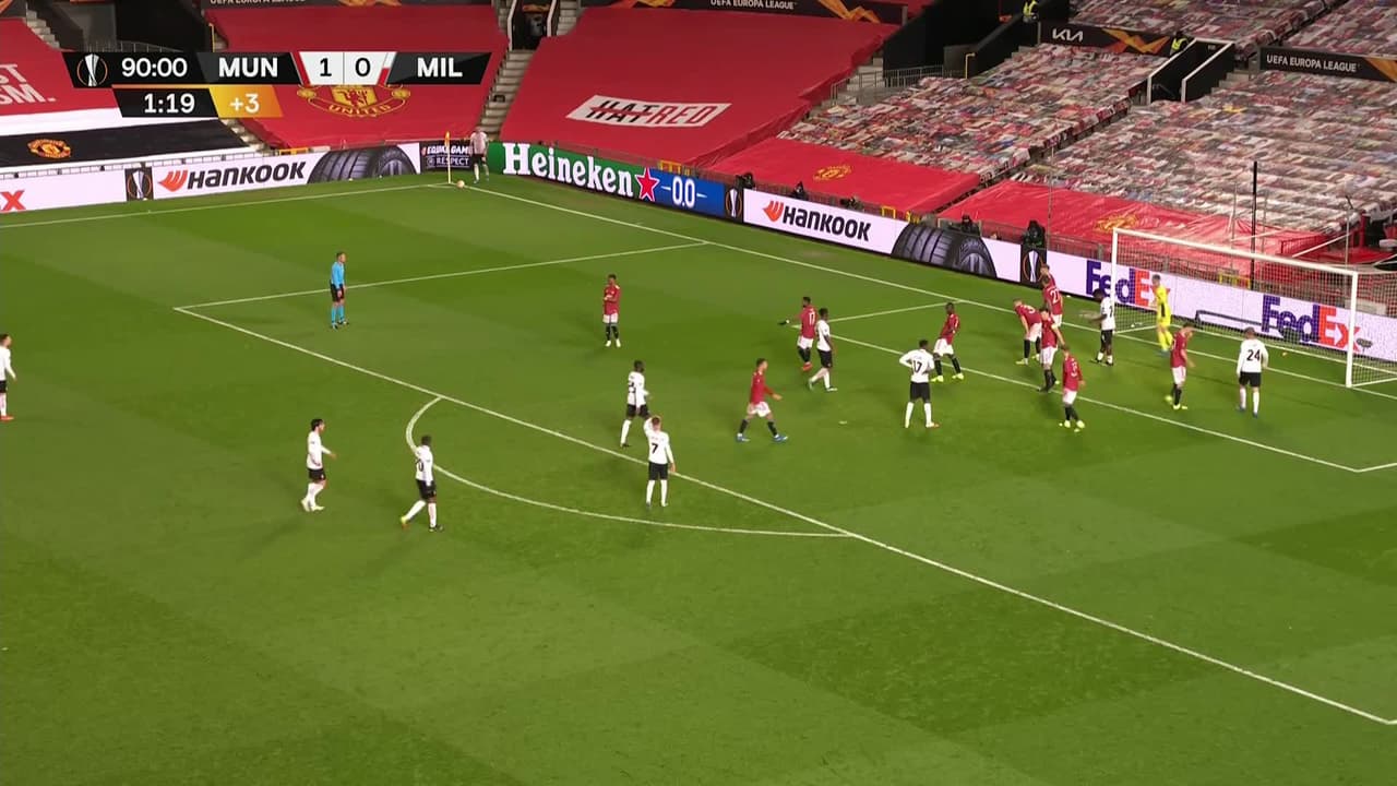 ¡Gol! Manchester United 1| Milan 1. Simon Kjaer (Milan) disparo de cabeza desde el centro del área tras un saque de esquina.