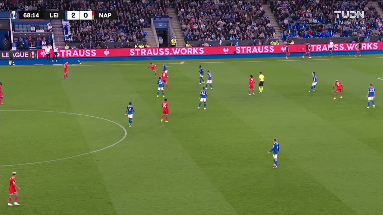 ¡Gooooool! Leicester City 2| Nápoles 1. Victor Osimhen (Nápoles) remate con la derecha desde el centro del área.