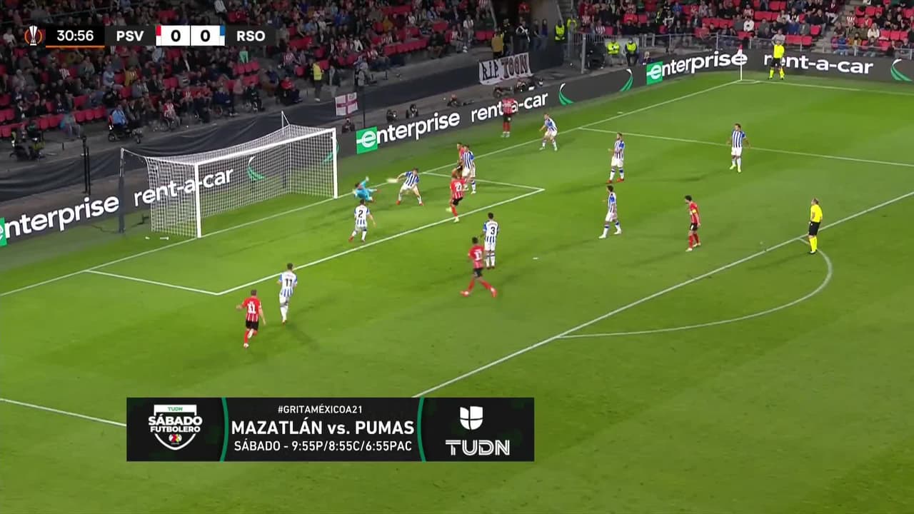 ¡Gooooool! PSV Eindhoven Eindhoven 1| Real Sociedad 0. Mario Götze (PSV Eindhoven Eindhoven) remate con la derecha desde el centro del área a la escuadra izquierda.