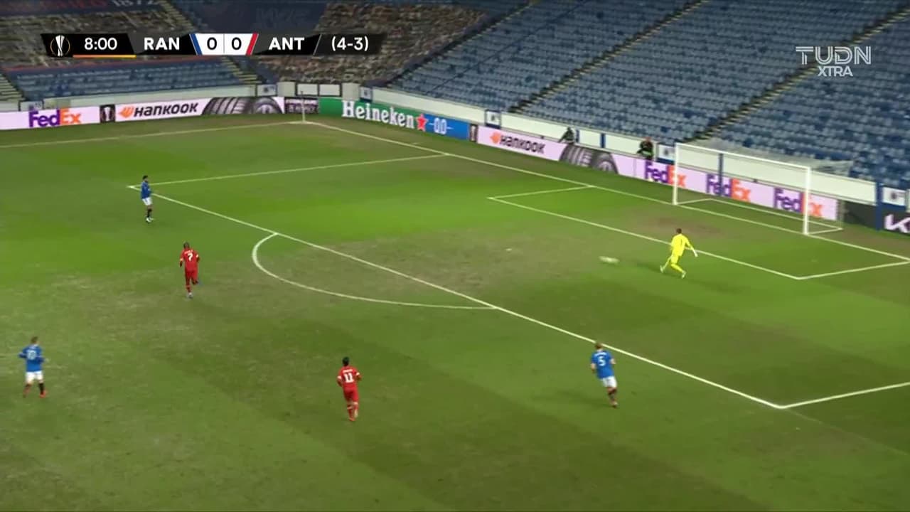 ¡Gol! Rangers 1| Royal Antwerp 0. Alfredo Morelos (Rangers) Disparo con la derecha desde el centro del área al centro de la portería. Asistencia de Ryan Kent.