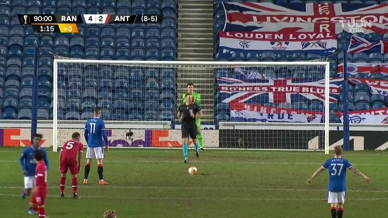¡Gol! Rangers 5| Royal Antwerp 2. Cedric Itten (Rangers) convirtió el penalti Disparo con la derecha por el centro del arco.