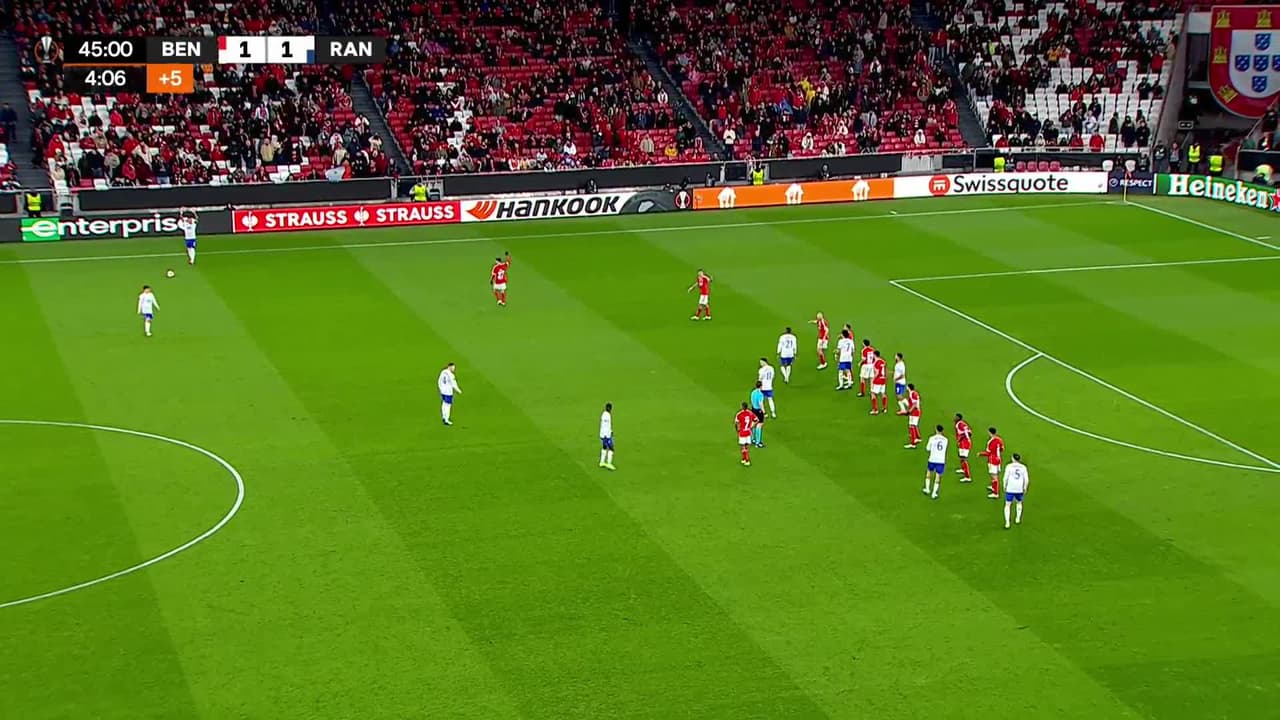 ¡Gol! Benfica 1| Rangers 2. Dujon Sterling (Rangers) Disparo con la derecha desde muy cerca tras el cobro de una falta.