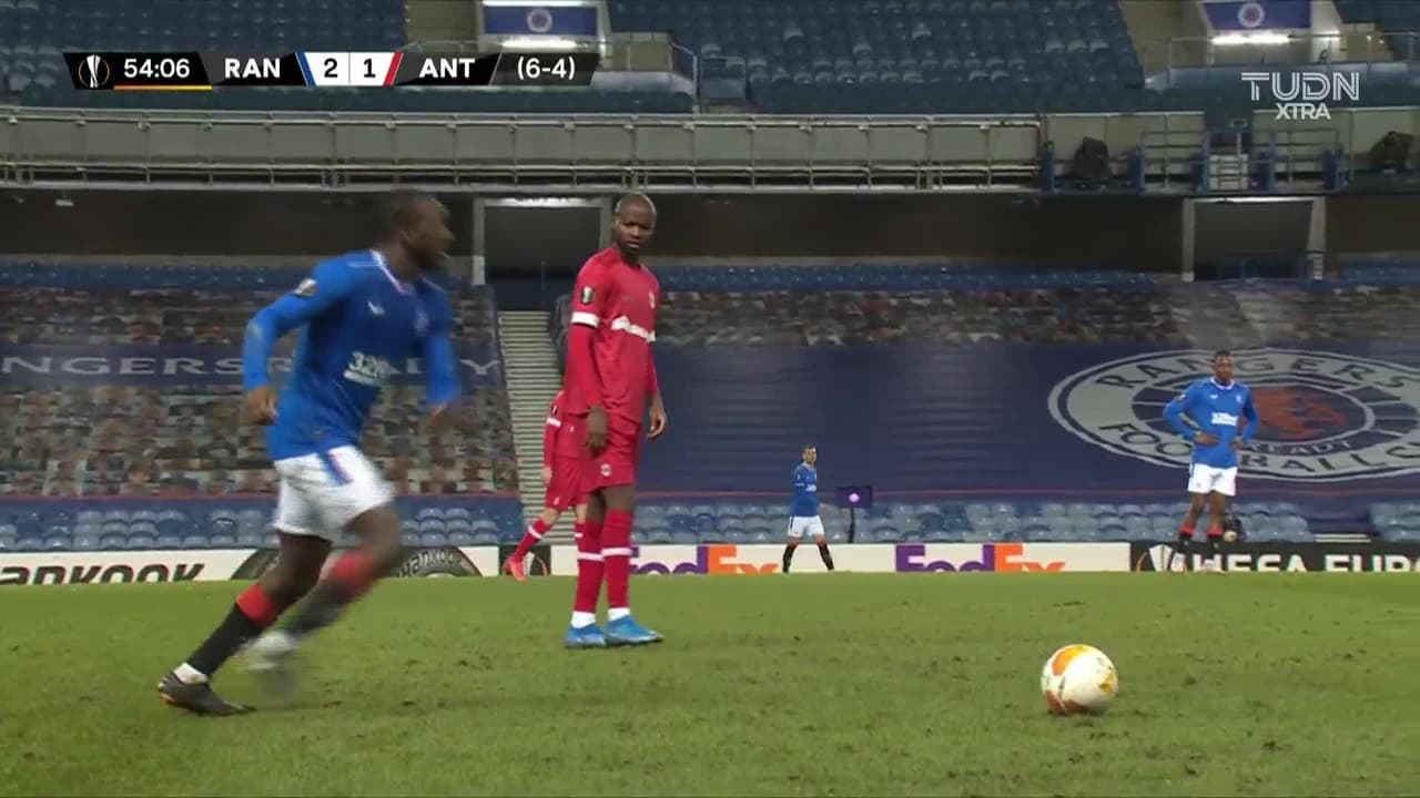 ¡Gol! Rangers 3| Royal Antwerp 1. Ryan Kent (Rangers) zurdazo desde el centro del área por el lado derecho de la portería. Asistencia de Alfredo Morelos.