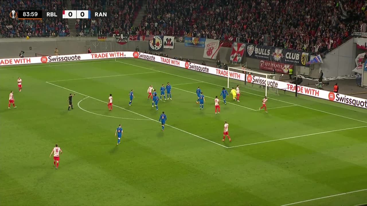 ¡Gol! RB Leipzig 1| Rangers 0. Angeliño (RB Leipzig) zurdazo desde fuera del área disparo rastrero| junto al palo izquierdo tras un saque de esquina.