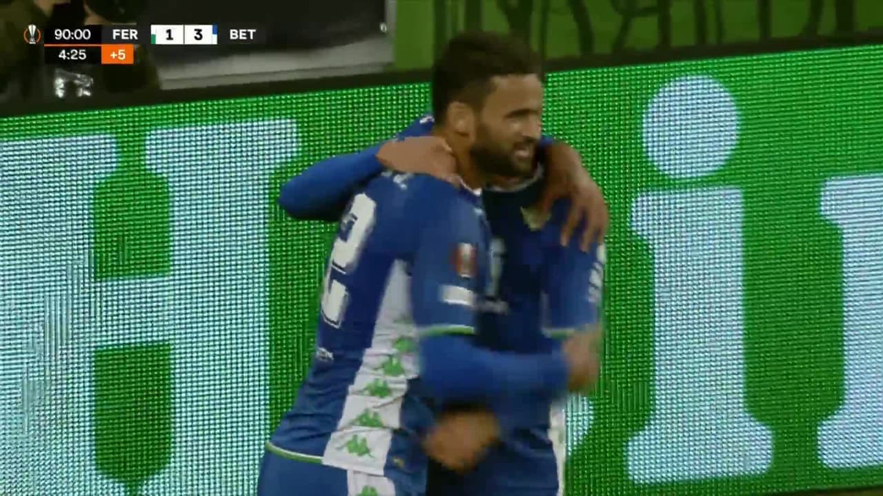 ¡Gooooool! Ferencvaros 1| Real Betis 3. Cristian Tello (Real Betis) remate con la derecha desde fuera del área.