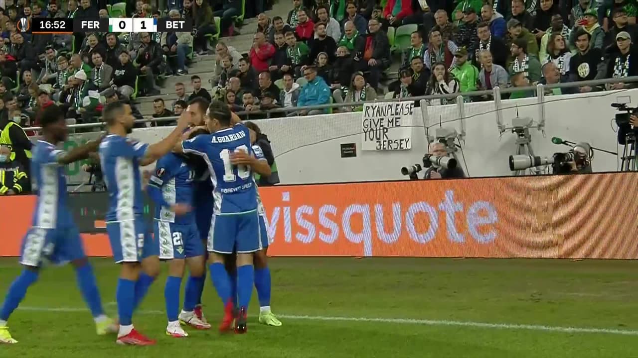 ¡Gooooool! Ferencvaros 0| Real Betis 1. Nabil Fekir (Real Betis) remate con la derecha desde el centro del área.