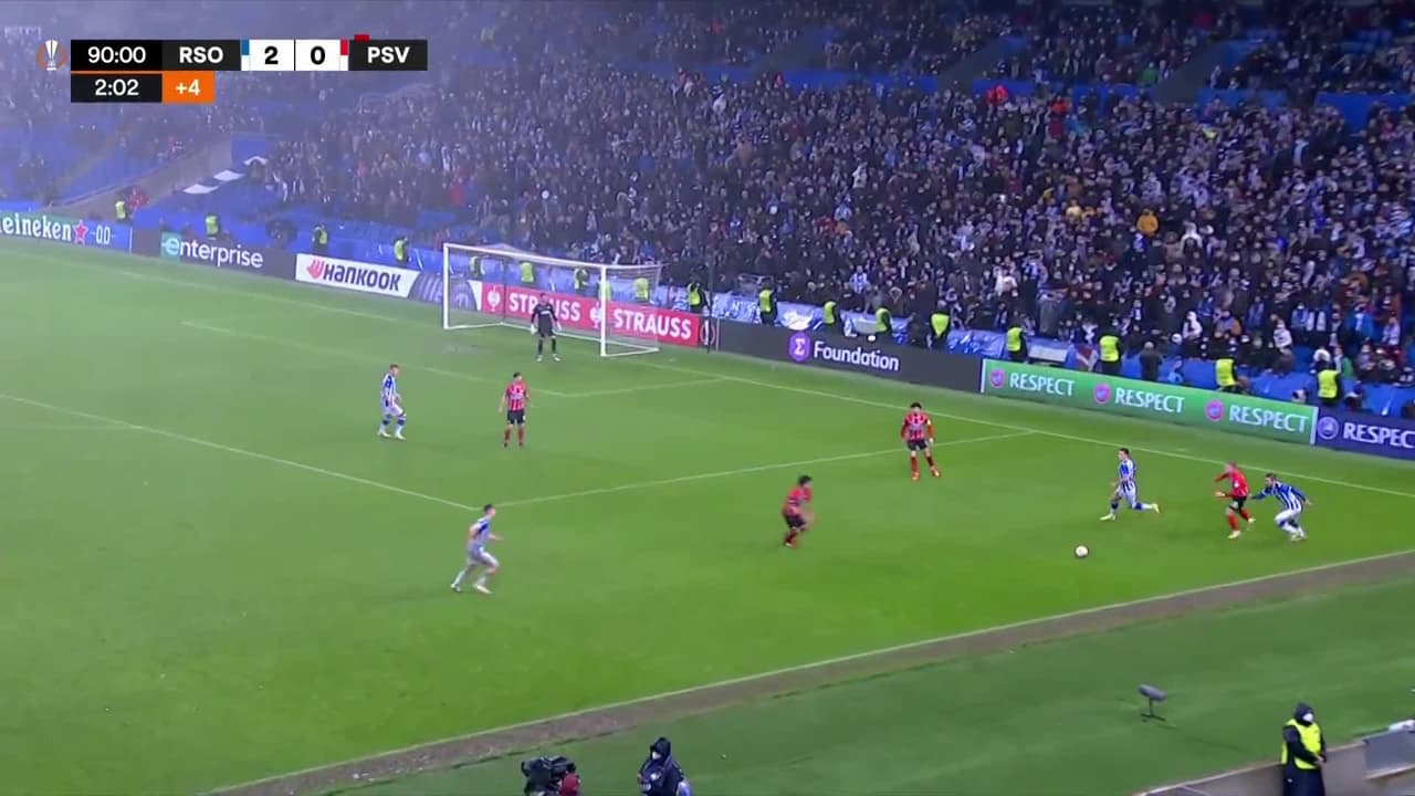 ¡Gol! Real Sociedad 3| PSV Eindhoven 0. Alexander Sørloth (Real Sociedad) zurdazo desde el lado izquierdo dentro del área.