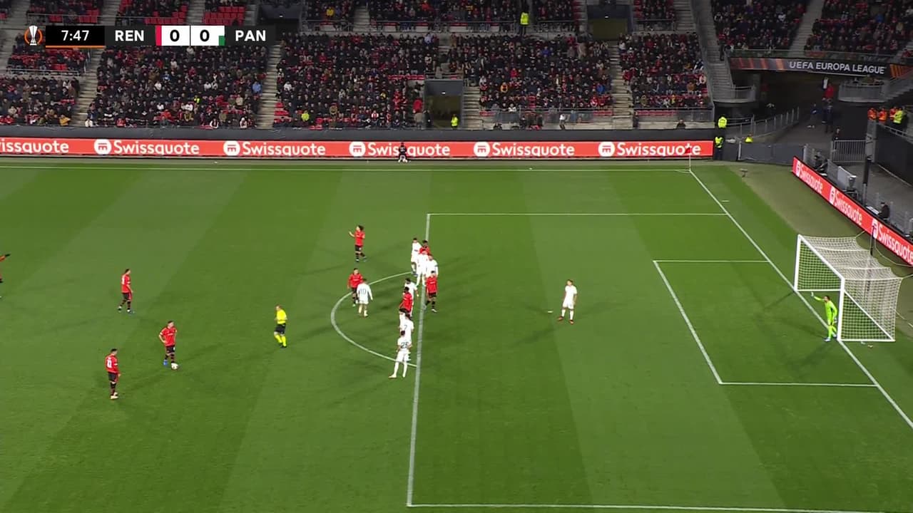 ¡Gol! Rennes 1| Panathinaikos 0. Fabian Rieder (Rennes) marca de tiro libre directo| zurdazo.