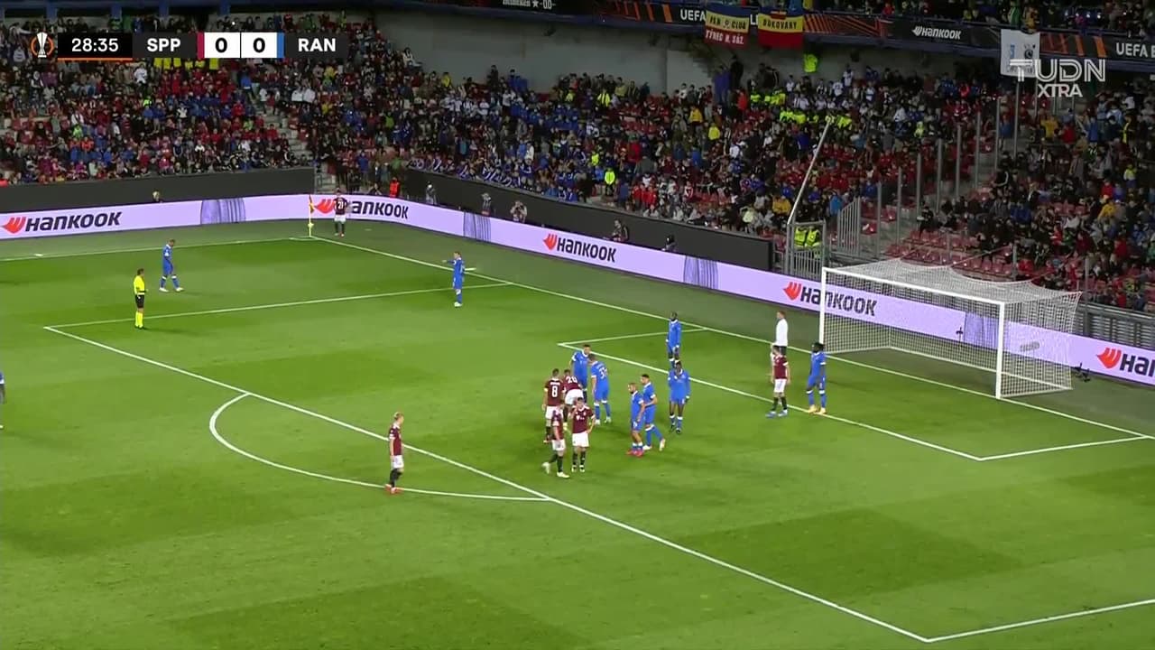 ¡Gooooool! Sparta Prague 1| Glasgow Rangers 0. Dávid Hancko (Sparta Prague) remate de cabeza desde el centro del área tras un saque de esquina.