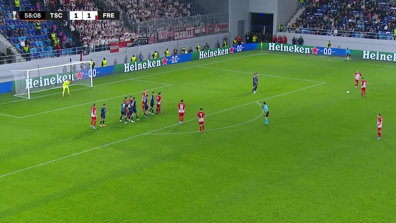 ¡Gol! Backa Topola 1| Sport-Club Freiburg 2. Vincenzo Grifo (Sport-Club Freiburg) marca de tiro libre directo| Disparo con la derecha.