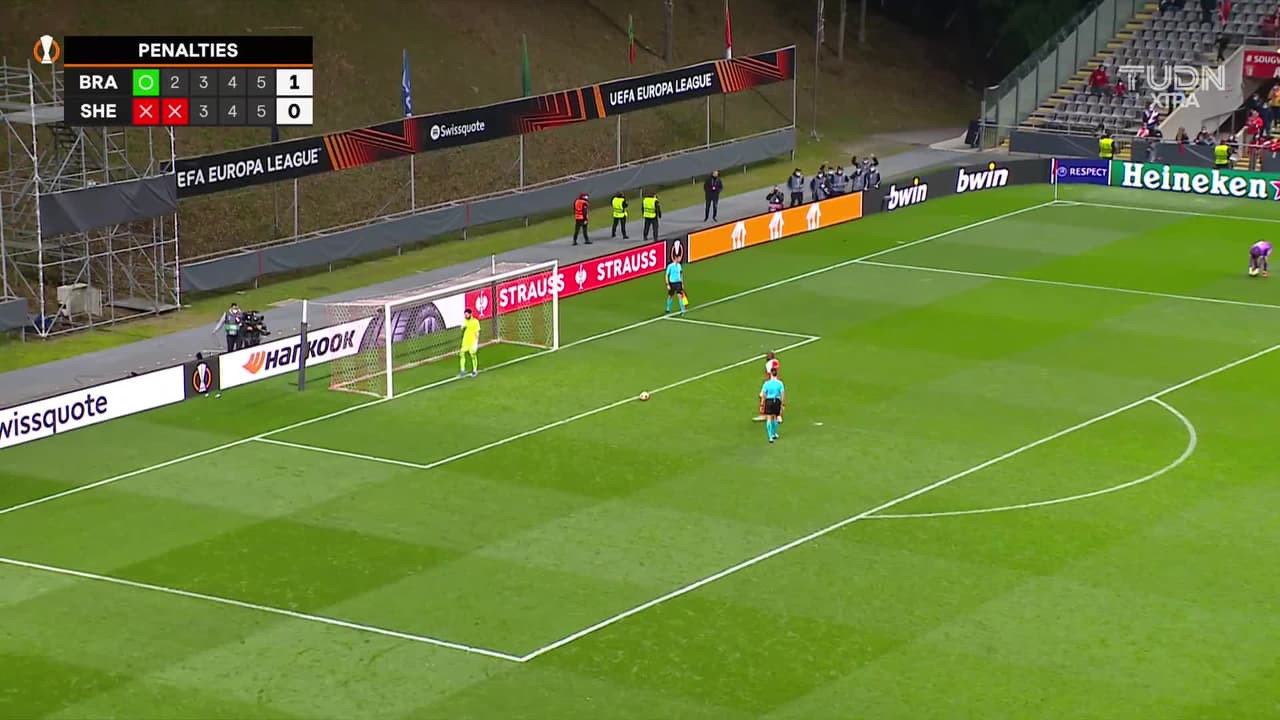 ¡Gol! Sporting Braga 2(2)| Sheriff Tiraspol 0. Al Musrati (Sporting Braga) convirtió el penalti Disparo con la derecha por el lado derecho de la portería.