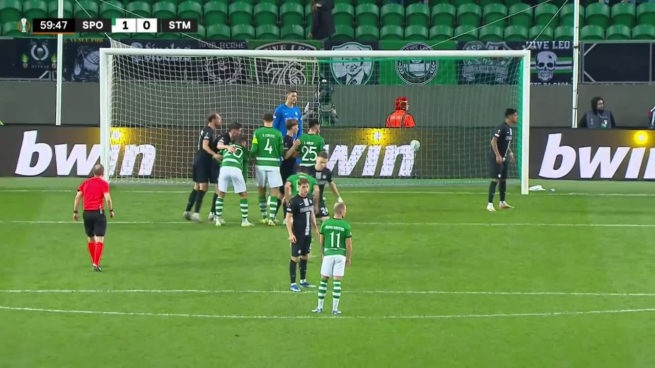 ¡Gol! Sporting Lisbon 2| SK Puntigamer Sturm Graz 0. Gonçalo Inácio (Sporting Lisbon) disparo de cabeza a quemarropa desde el lado derecho tras un saque de esquina.