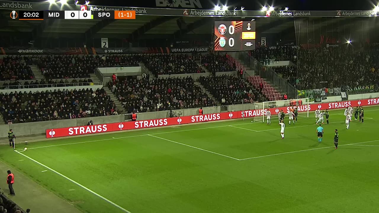 ¡Gol! FC Midtjylland 0| Sporting Lisbon 1. Sebastián Coates (Sporting Lisbon) disparo de cabeza desde muy cerca al centro de la portería tras un saque de esquina.