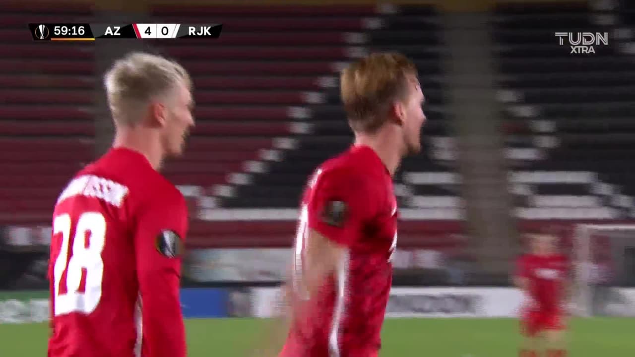 ¡Gol! AZ 4| HNK Rijeka 0. Albert Gudmundsson (AZ) Disparo con la derecha desde el centro del área por el lado derecho de la portería. Asistencia de Teun Koopmeiners con un centro al área.