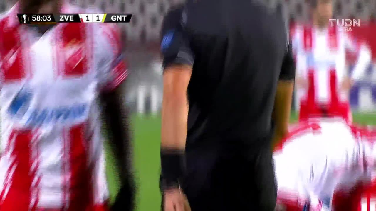 ¡Gol! Estrella Roja de Belgrado 2| KAA Gent 1. Aleksandar Katai (Estrella Roja de Belgrado) marca de tiro libre directo| Disparo con la derecha por el lado derecho de la portería.