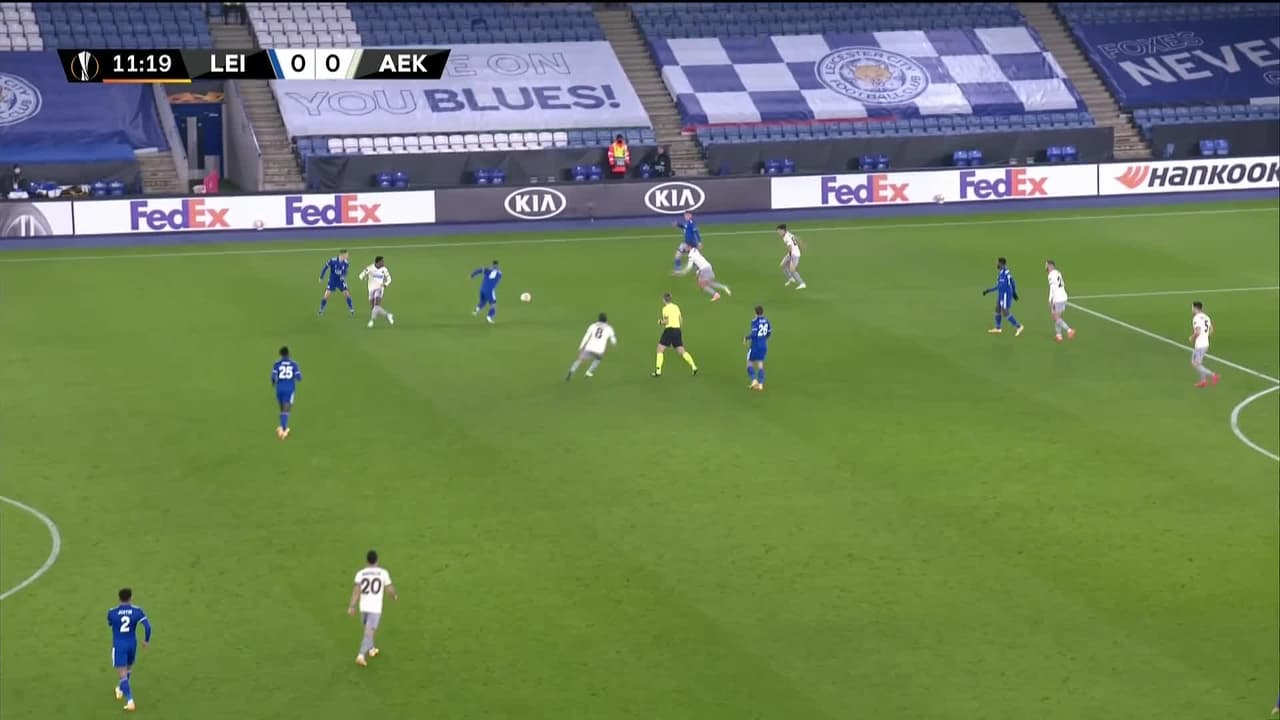 ¡Gol! Leicester City 1| AEK Athens 0. Cengiz Ünder (Leicester City) zurdazo desde el centro del área por el lado derecho de la portería.