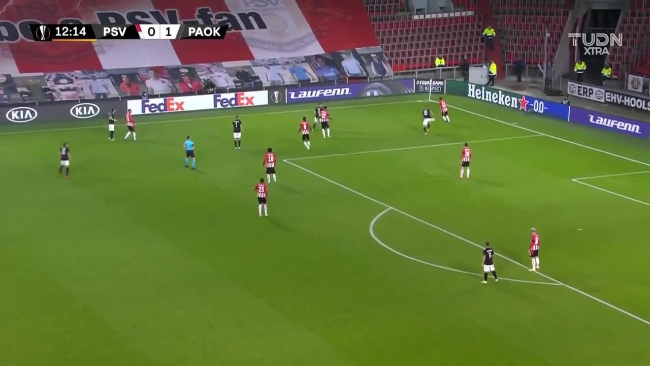 ¡Gol! PSV Eindhoven 0| PAOK Salonika 2. Christos Tzolis (PAOK Salonika) zurdazo desde el centro del área disparo rastrero| junto al palo izquierdo. Asistencia de Stefan Schwab.